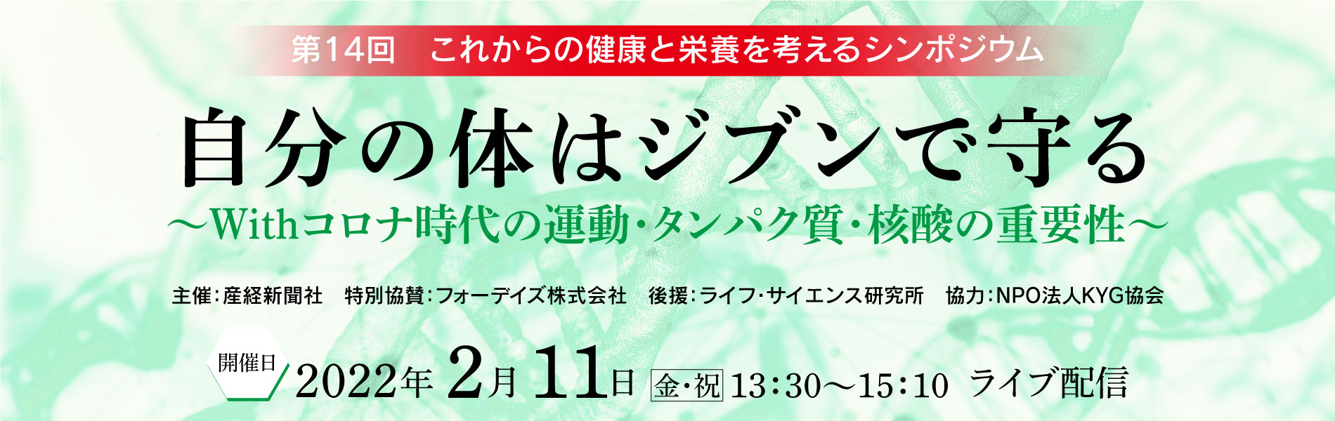 第14回 これからの健康と栄養を考えるシンポジウム  自分の体はジブンで守る~Withコロナ時代の運動・たんぱく質・核酸の可能性~のライブ配信は終了いたしました。